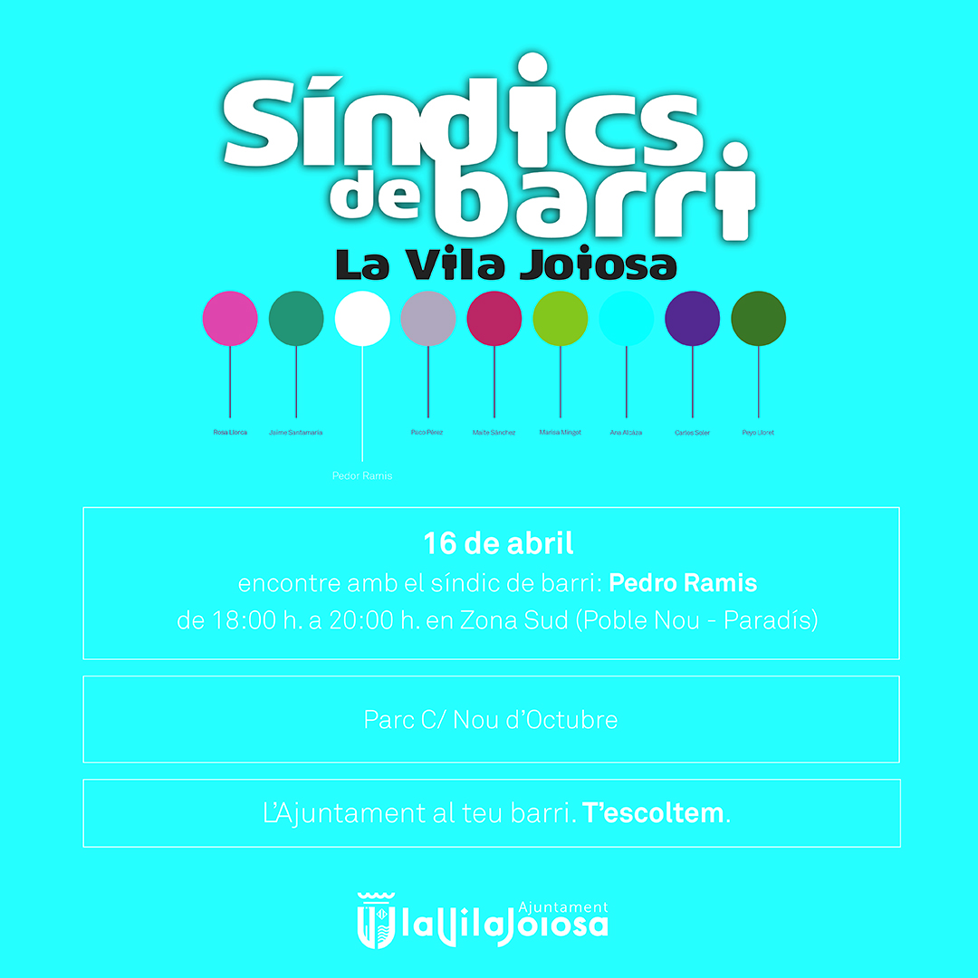 El Ayuntamiento de Villajoyosa continúa la próxima semana la campaña Síndic de Barri 2026 con un nuevo encuentro con vecinos de manos del concejal Pedro Ramis en Poble Nou-Paradís. Será el jueves, 16 de abril, de 18:00 a 20:00 horas, en el parque de la calle 9 d’Octubre.