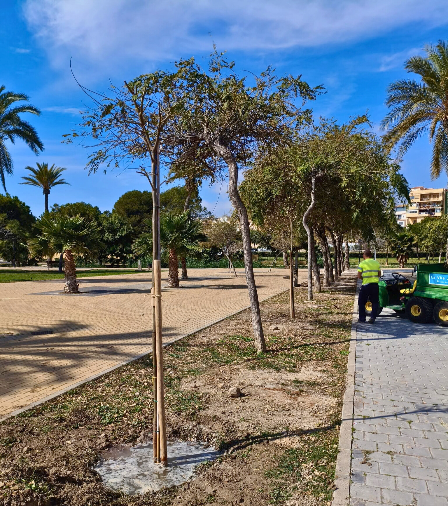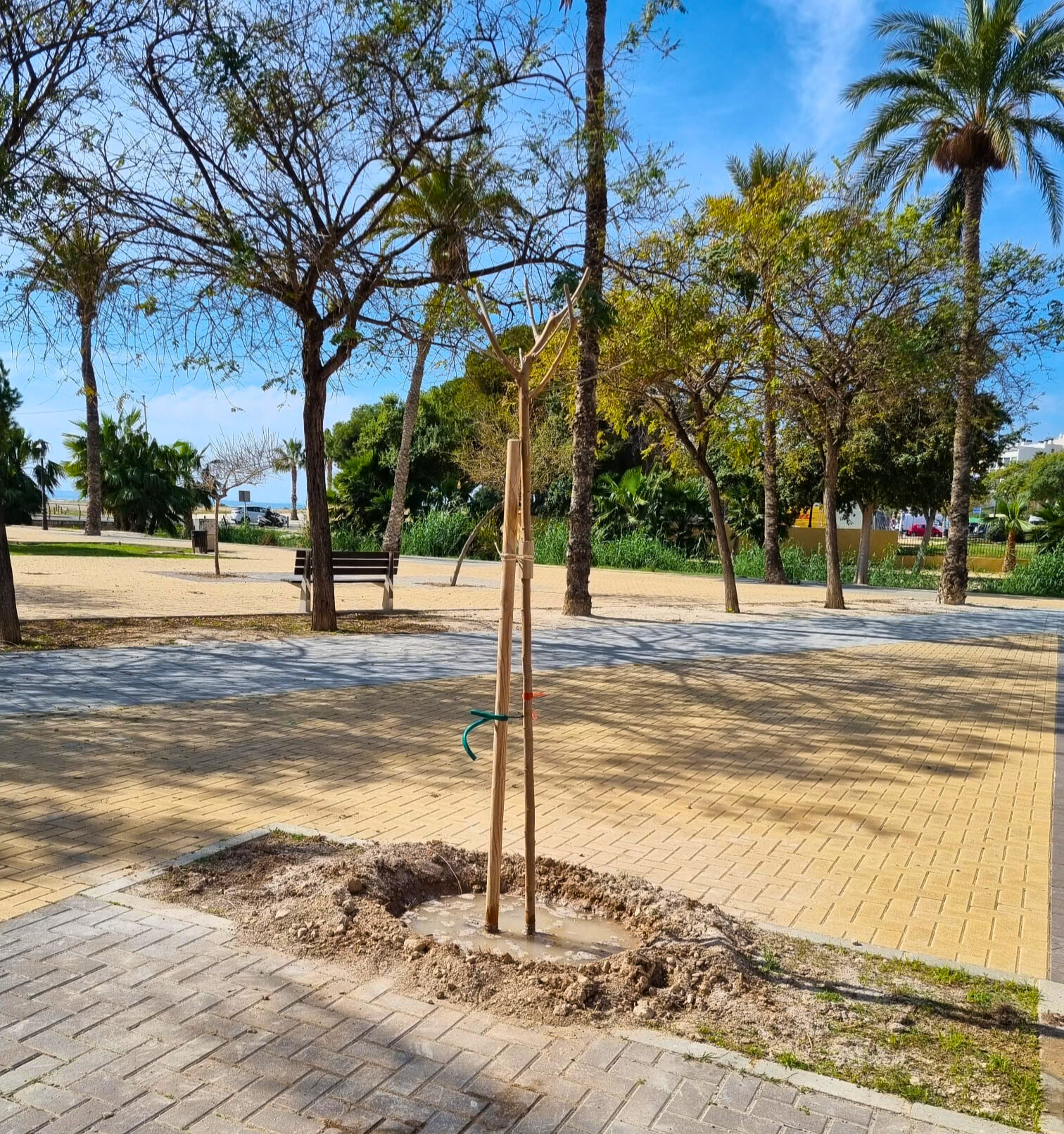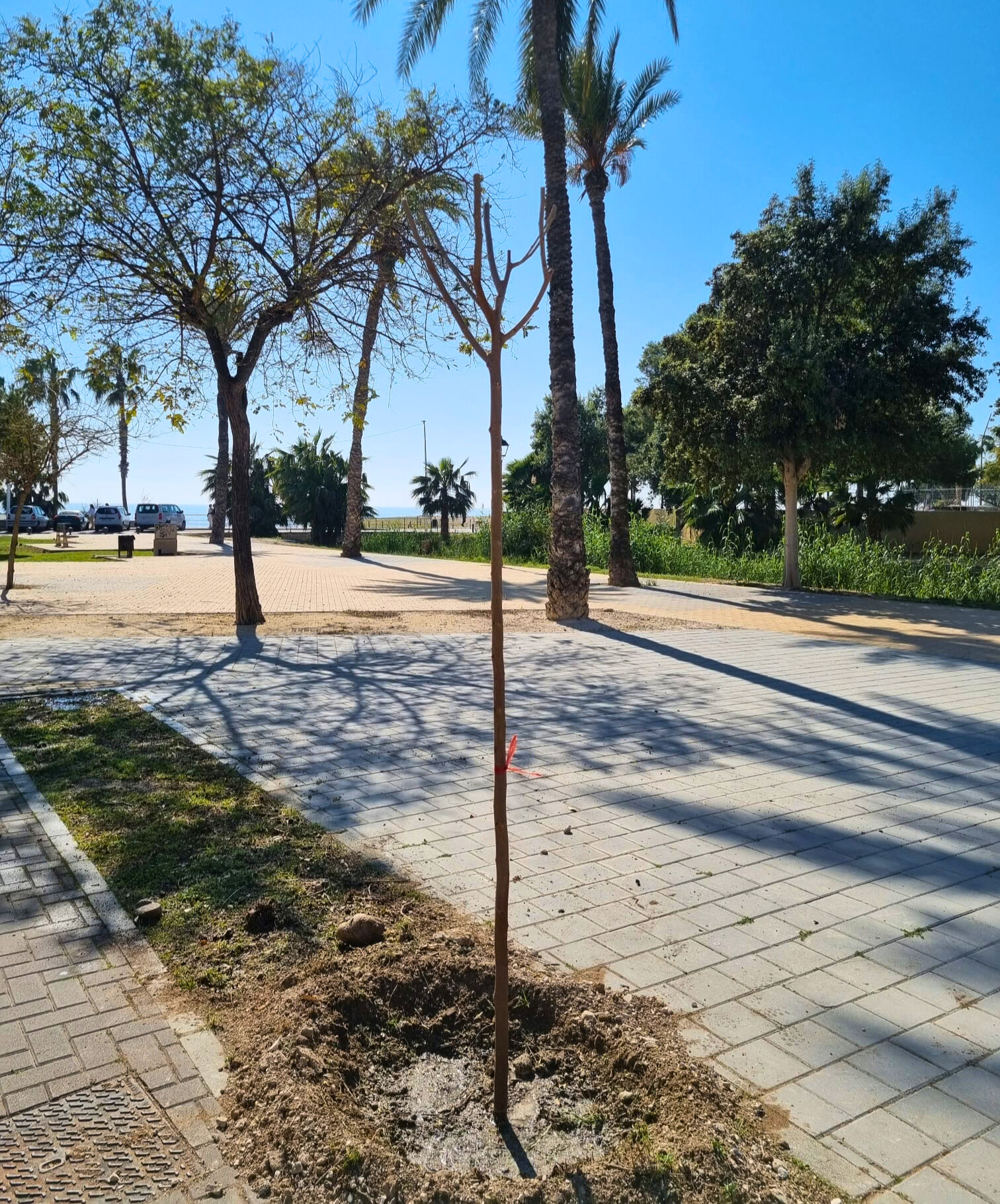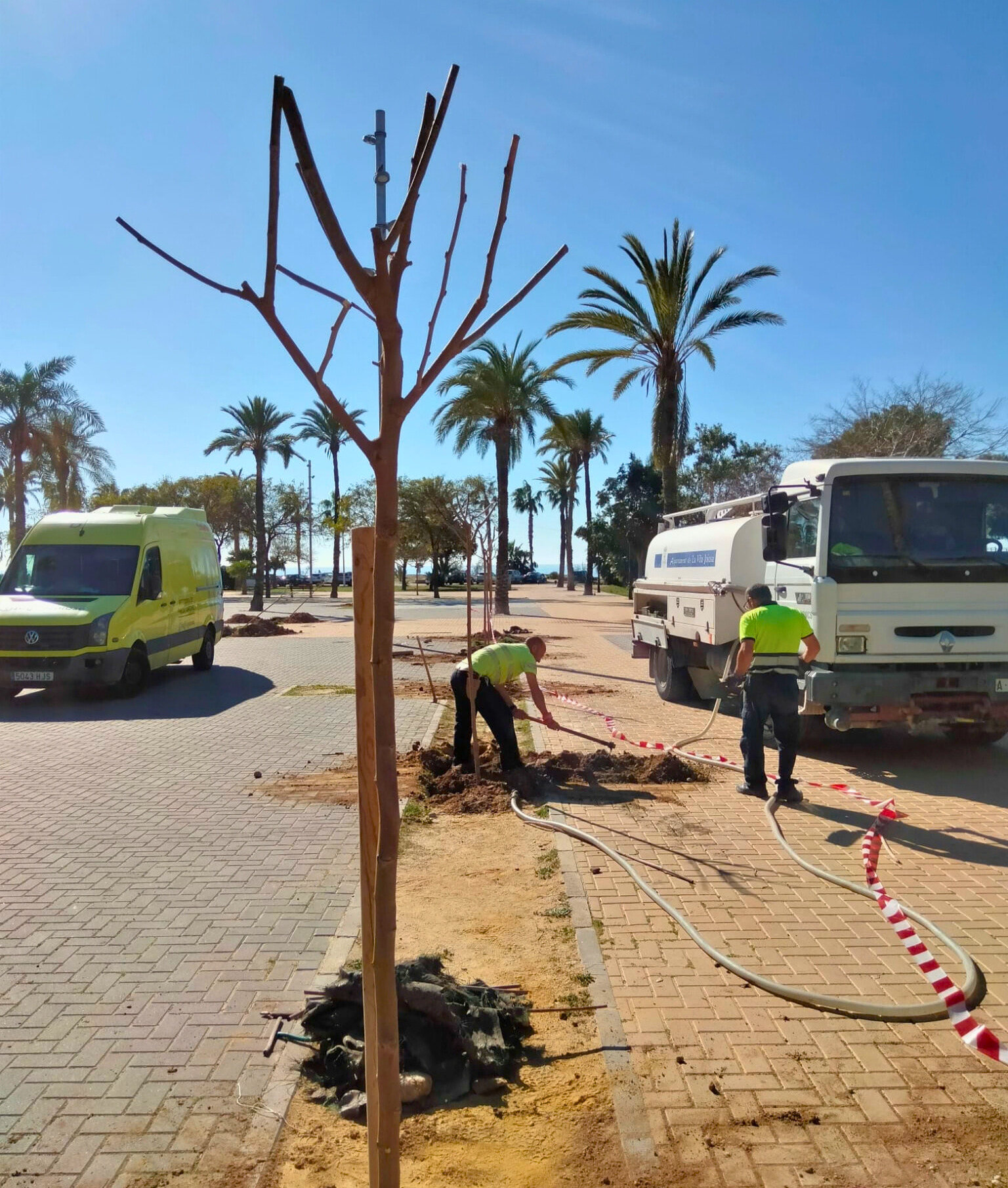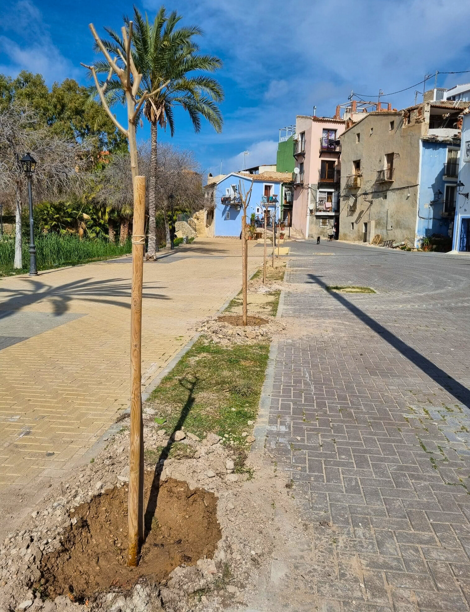 Trabajadores municipales del área de Escena Urbana han plantado nueve moreras y 2 tipuanas en las jardineras que estaban inutilizadas en la zona pavimentada de la desembocadura del río Amadorio. Esta tarea permitirá contar con nuevas zonas de sombra.