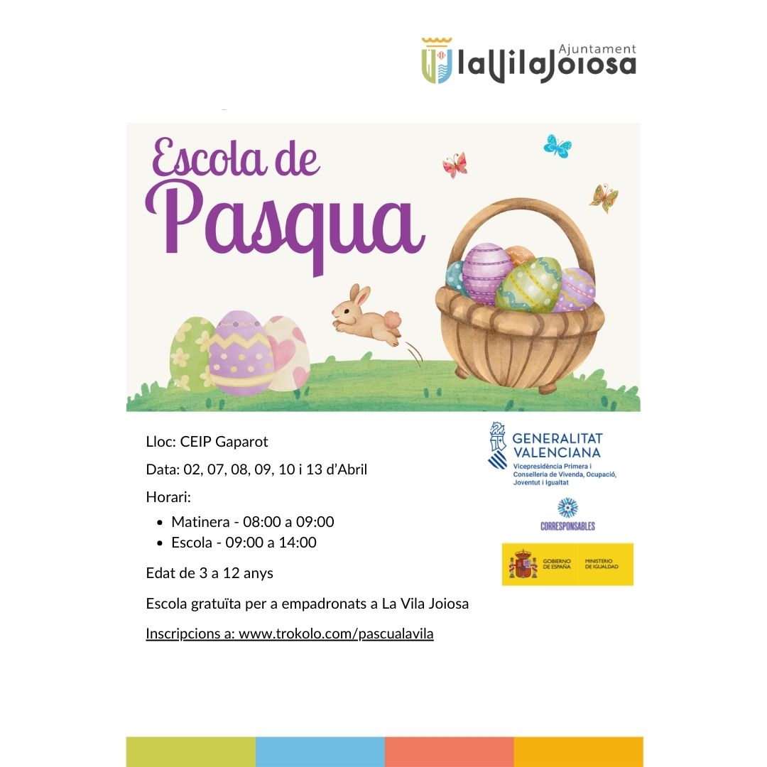 Inicio Agenda Municipal Bienestar Social Evento ESCUELA DE PASCUA ESCUELA DE PASCUA Se realiza en el CEIP GASPAROT Inscripciones hasta el 28 de marzo en este enlace: Escuela de Pascua La Vila joiosa + Añadir Google Calendar Exportación + iCal / Outlook El evento está en curso. Fecha 17 - 27 Mar 2026 En curso... Hora 8:00 am - 6:00 pm Categoría Bienestar Social Evento Compartir este evento