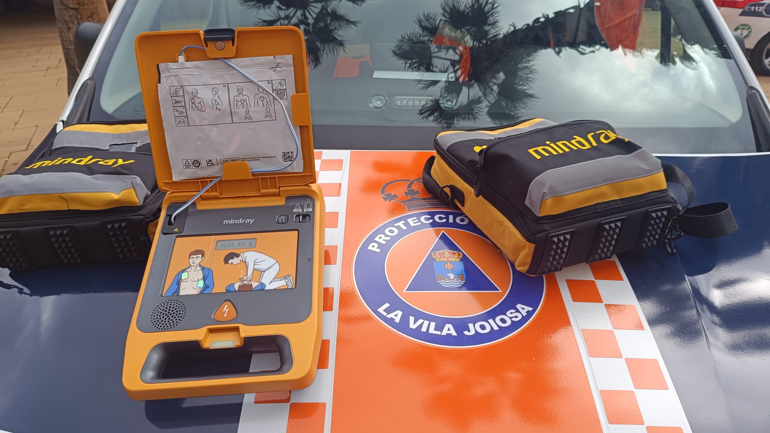 Los desfibriladores externos automáticos (DEA) son dispositivos portátiles livianos que permiten actuar en caso de paro cardiaco. Los dos coches de Protección Civil cuentan con una pegatina identificativa como “vehículo con desfibrilador”. Además, con la incorporación de este tipo de material técnico se amplía también la formación a los miembros de esta entidad.