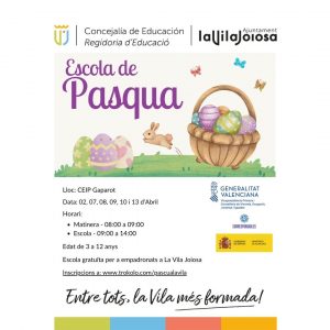 Home Agenda Municipal Bienestar Social Event ESCOLA DE PASQUA ESCOLA DE PASQUA Es realitza al CEIP GASPAROT Inscripcions fins 28 de març a aquest enllaç: Escuela de Pascua La Vila joiosa + Add to Google Calendar + iCal / Outlook export The event is ongoing. Data 17 - 27 Mar 2026 Ongoing... Hora 8:00 am - 6:00 pm Categoria Bienestar Social Event Compartir este esdeveniment
