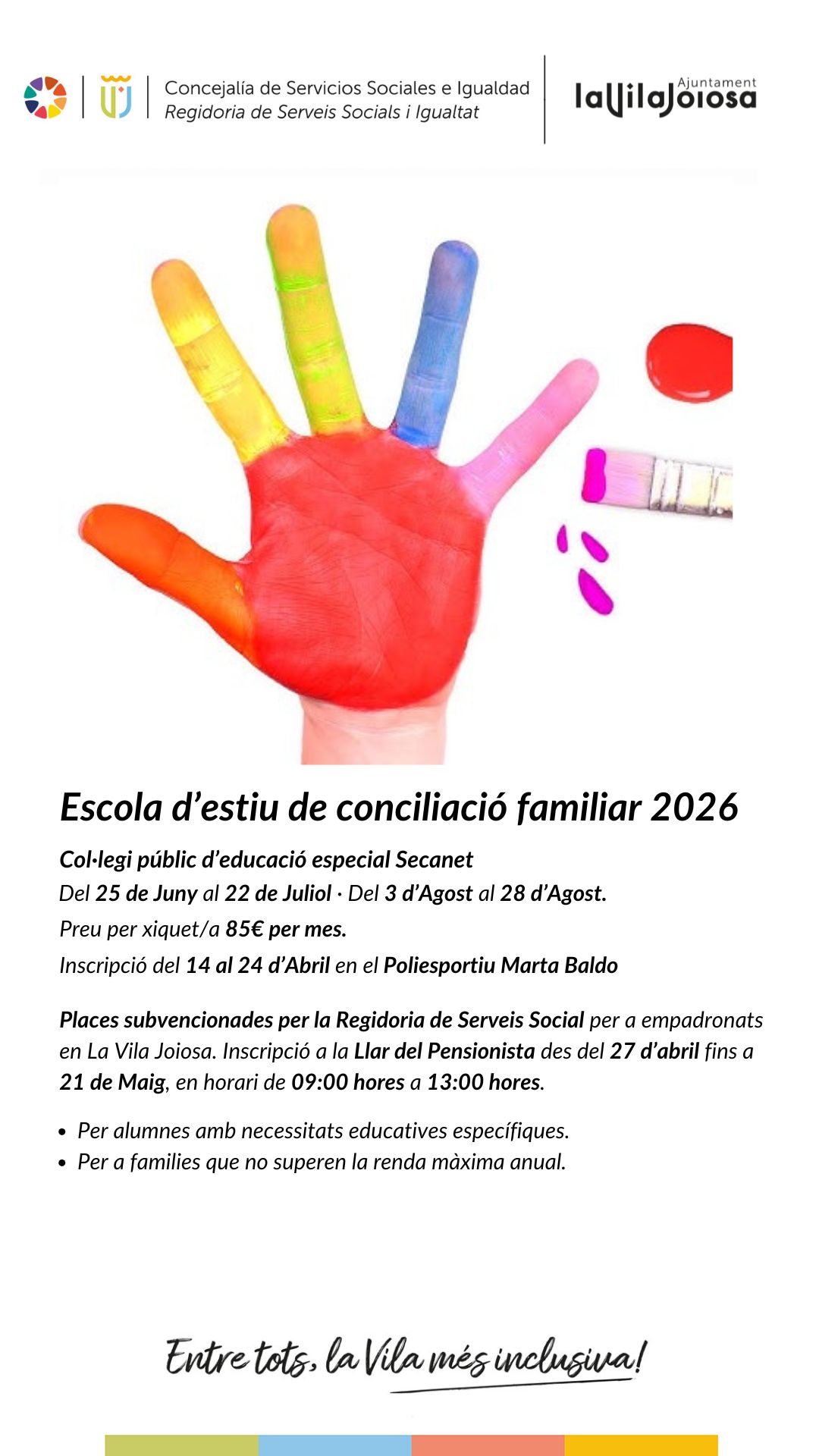 Poden participar en les escoles d’estiu municipals els xiquets i xiquetes entre 3 i 16 anys empadronats a la Vila Joiosa. El preu mensual és de 85 euros (7 euros més en el cas del menjador) i s’ofereixen places subvencionades per la regidoria de Serveis Socials i Igualtat. El termini per a sol·licitar aquestes ajudes serà des del 27 d’abril fins al 21 de maig, de dilluns a divendres de 9 a 13 hores, en el centre social Llar del Pensionista.