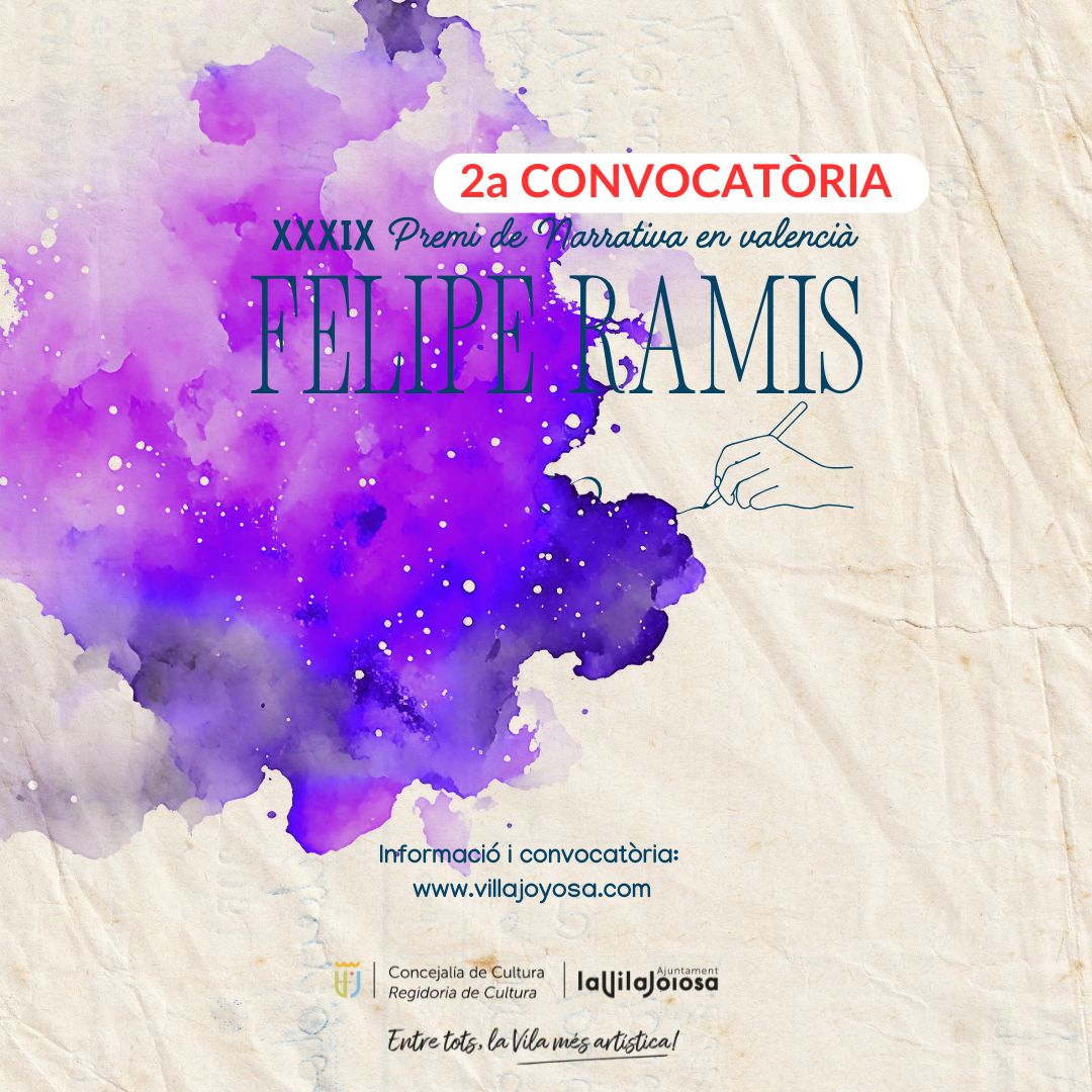 La Regidoria de Cultura de l’Ajuntament de la Vila Joiosa torna a convocar la XXXIX edició del Premi de Narrativa en Valencià Felipe Ramis 2025. Es tracta d’un certamen literari que compta amb una llarga trajectòria i reconeixement, a més de generar un destacat interès pel nombre de participants que presenten les seves propostes literàries en cada convocatòria.