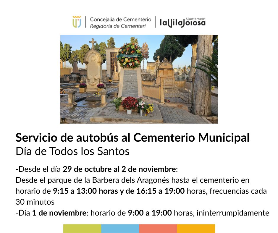 El servicio de autobús, desde el parque de la Barbera dels Aragonés, tendrá una frecuencia de media hora y un horario de 9:15 a 13:00 horas y de 16:15 a 19:00 horas todos los días, excepto el día 1 de noviembre que será de forma continuada de 9:00 a 19:00 horas.