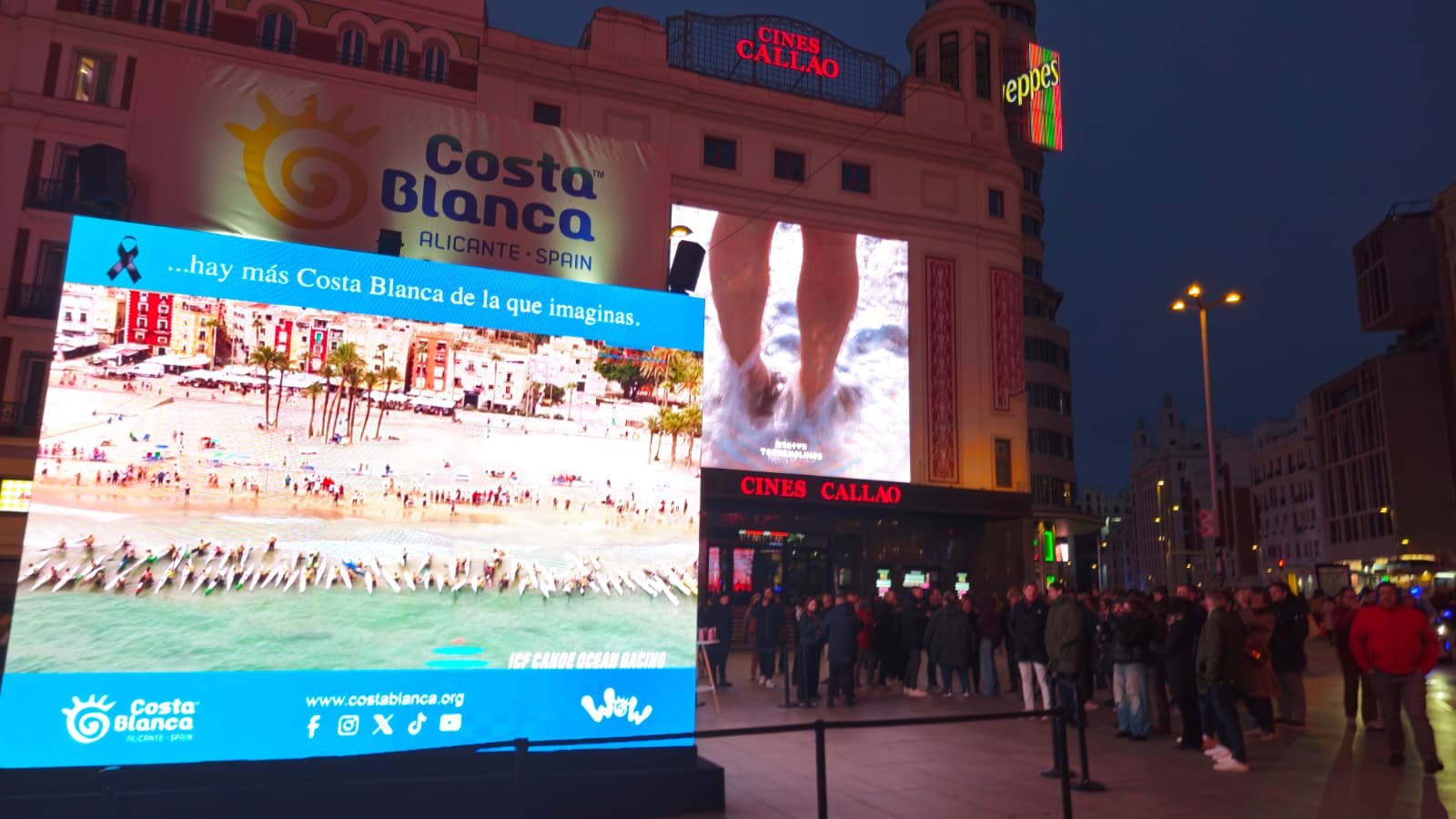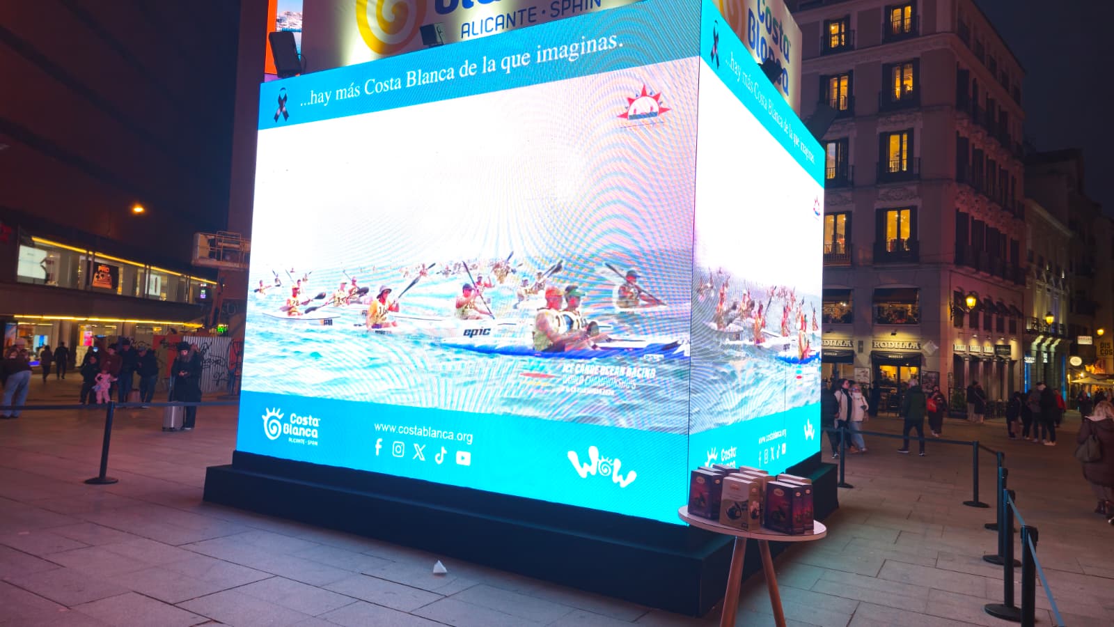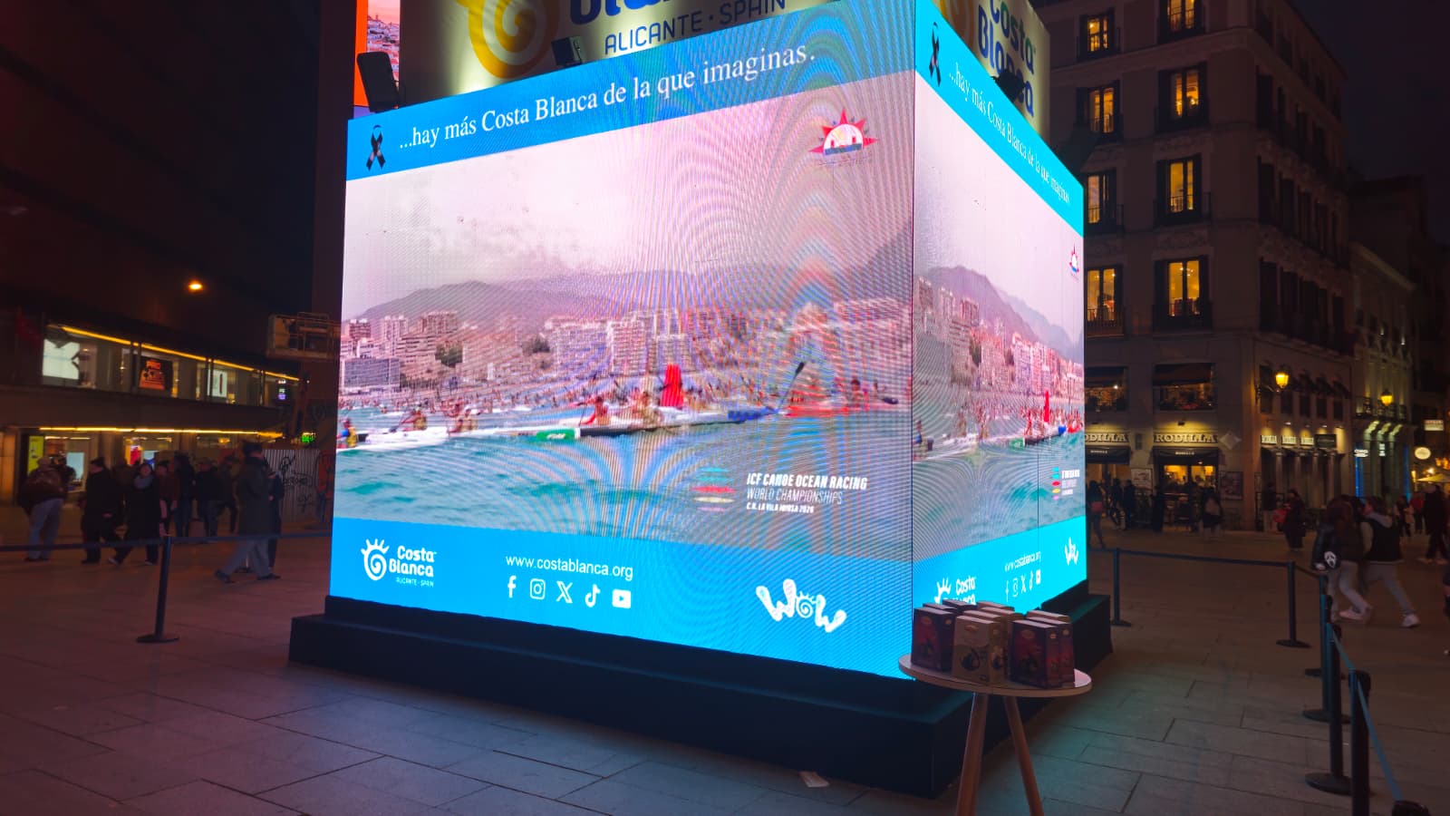 El Ayuntamiento de Villajoyosa ha presentado en la plaza de Callao de Madrid la celebración del Campeonato del Mundo de Kayak de Mar que se celebrará del 9 al 12 de octubre de 2026 en el municipio. Este acto, celebrado en el marco de la Feria Internacional de Turismo (Fitur), ha contado con la proyección de un vídeo promocional sobre el evento deportivo en el cubo digital que ha instalado el Patronato de Turismo Costa Blanca en esta conocida plaza. Al finalizar, se ha repartido chocolate entre los asistentes.